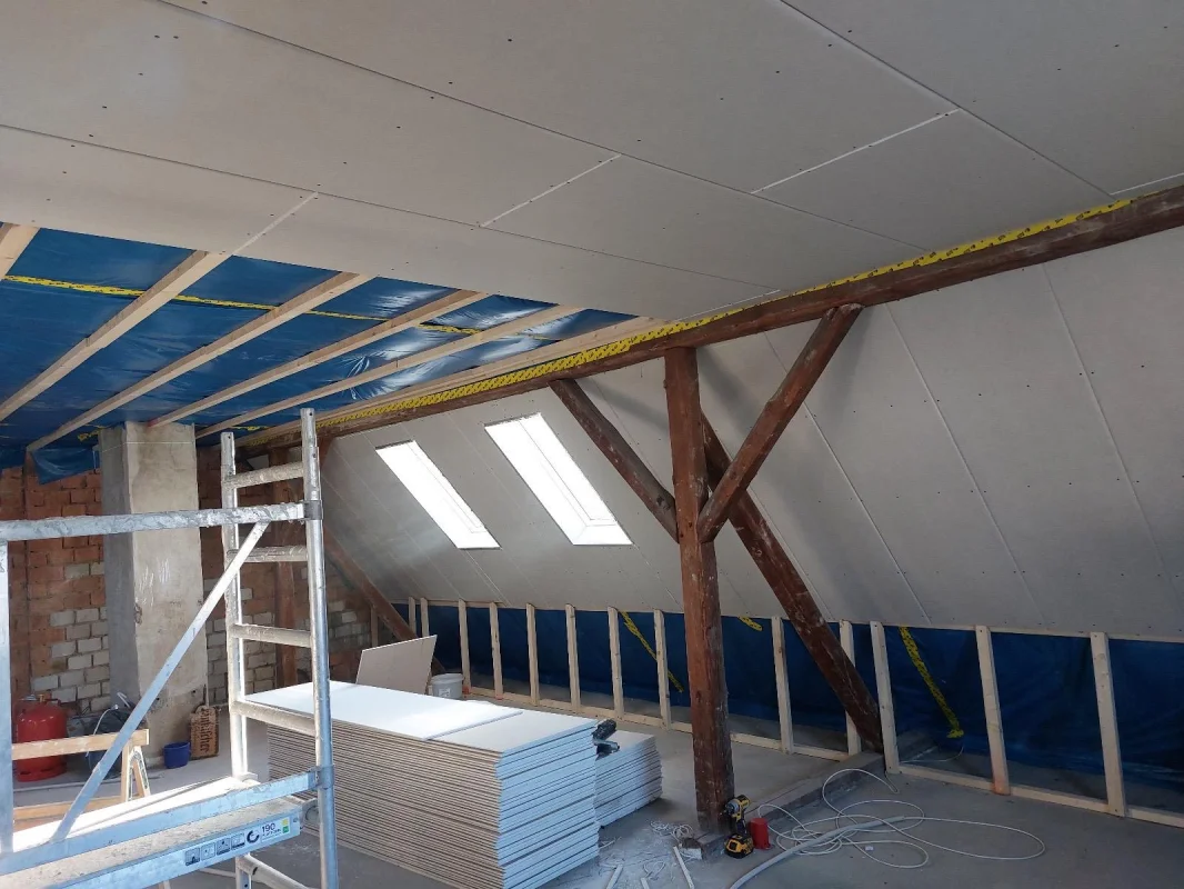 Kompletter Dachausbau aus einer Hand: Unterkonstruktion, Dämmung, Dampfbremse und Verkleidung. Fenster und Anschlüsse sauber integriert – für hellen, gut nutzbaren Wohnraum mit angenehmem Klima.